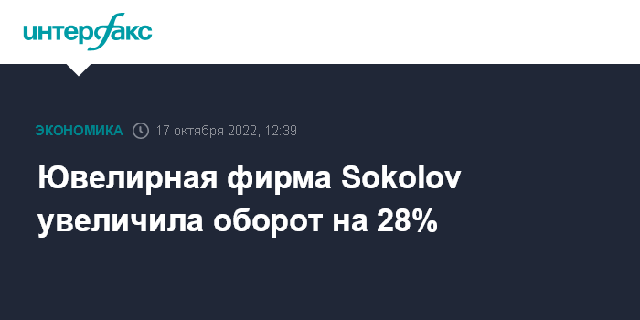 Москва. 17 октября. INTERFAX.RU - В январе-сентябре 2022 года производитель и продавец ювелирных изделий Sokolov увеличил оборот на 28% в годовом исчислении, до 21,4 млрд рублей (включая НДС).