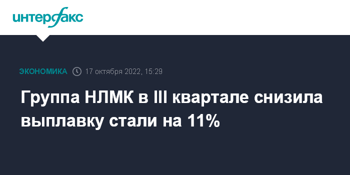 Москва. 17 октября. INTERFAX.RU - Группа НЛМК (флагманский актив - ПАО "Новолипецкий металлургический комбинат") в III квартале 2022 года произвела 3,9 млн тонн стали, что на 11% ниже показателя второго квартала.