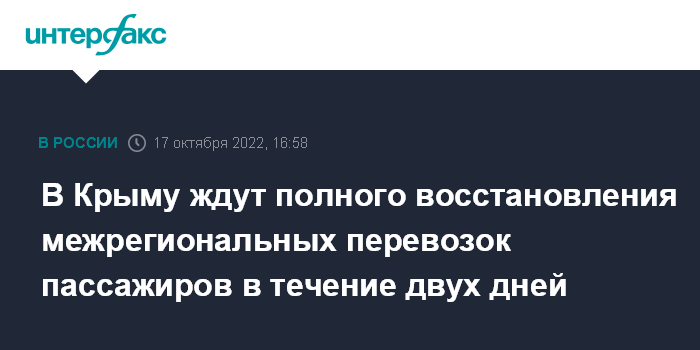 Москва. 17 октября. INTERFAX.RU - Межрегиональное пассажирское сообщение с Крымом возобновится в полном объеме в течение двух дней после снятия ограничения по движению автобусов на Крымском мосту, сообщили в министерстве транспорта республики.