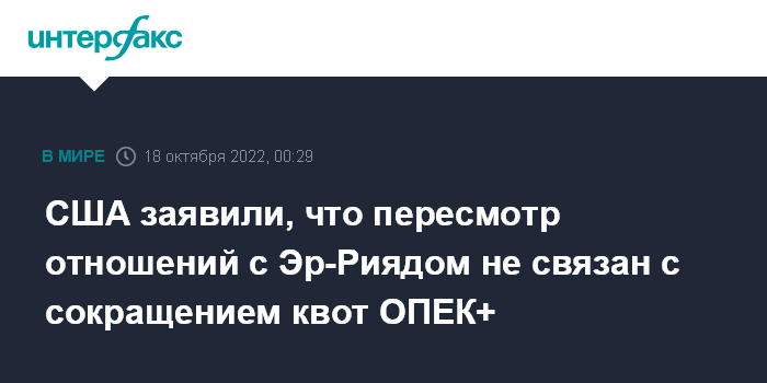 Москва. 17 октября. INTERFAX.RU - Пересмотр Вашингтоном отношений США и Саудовской Аравии не связан с недавним решением ОПЕК+ о сокращении добычи, а обсуждается уже давно, заявили в понедельник в Госдепартаменте.