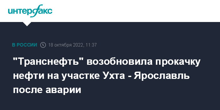 Москва. 18 октября. INTERFAX.RU - АО "Транснефть - Север" завершило ремонт после выхода нефти на участке магистрального нефтепровода (МН) Ухта - Ярославль и с 10 часов утра (по Москве) возобновило транспортировку нефти по этому участку. Об этом сообщила пресс-служба АО.