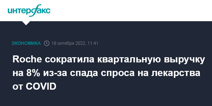 Москва. 18 октября. INTERFAX.RU - В III квартале 2022 года швейцарская фармацевтическая компания Roche Holding AG сократила выручку почти на 8% в третьем квартале текущего года на фоне ослабления спроса на продукцию, связанную с COVID-19, но подтвердила годовой прогноз.