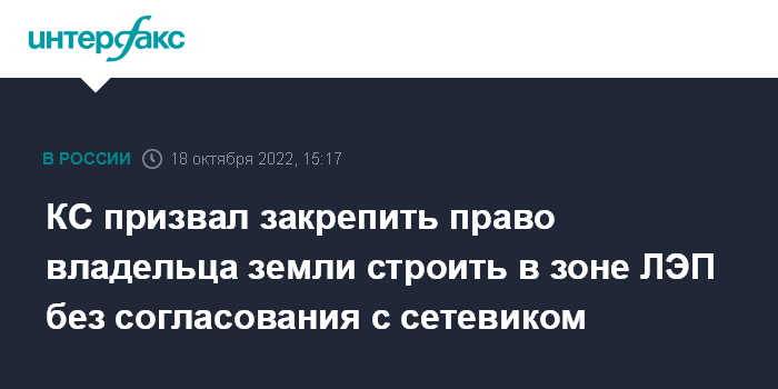Москва. 18 октября. INTERFAX.RU - Конституционный суд РФ постановил прописать в положении об охранных зонах объектов электроэнергетики порядок, при котором собственнику земли не потребуется предварительное письменное согласование строительства или реконструкции объектов электросетевого хозяйства с энергетиками.