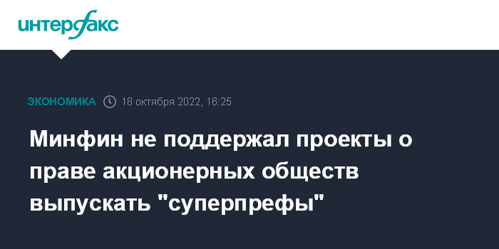 Москва. 18 октября. INTERFAX.RU - Минфин РФ не поддержал законопроекты Минэкономразвития, разрешающие непубличным акционерным обществам (НАО) в РФ выпускать "суперпрефы" – привилегированные акции с разным объемом прав и голосов и сохранять их при превращении в публичную высокотехнологичную компанию, рассказал источник "Интерфакса".