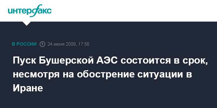 Москва. 24 июня. INTERFAX.RU - Внутриполитическая ситуация в Иране никак не влияет на планы по строительству АЭС в Бушере, сообщил "Интерфаксу" источник в Росатоме в среду.