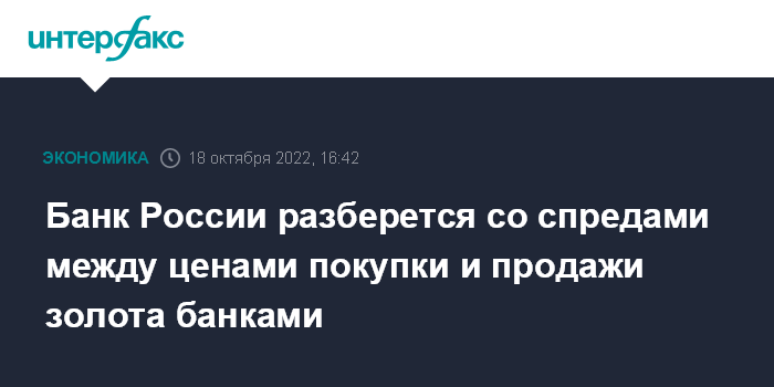 Москва. 18 октября. INTERFAX.RU - Банк России изучит сложившуюся ситуацию со спредами между ценами покупки и продажи золота банками, пообещал зампред ЦБ Алексей Заботкин. Он сказал об этом на совещании по регулированию оборота золота в Совете Федерации.