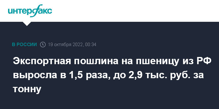 Москва. 19 октября. INTERFAX.RU - Экспортная пошлина на пшеницу из РФ с 19 октября составит 2 тыс. 934,3 рубля за тонну против 1 тыс. 926,8 рубля на предыдущей неделе.
