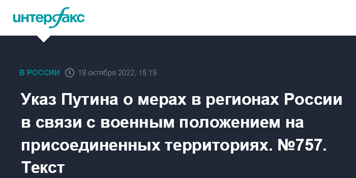 Указ Путина о мерах в регионах России в связи с военным положением на присоединенных территориях. №757. Текст
