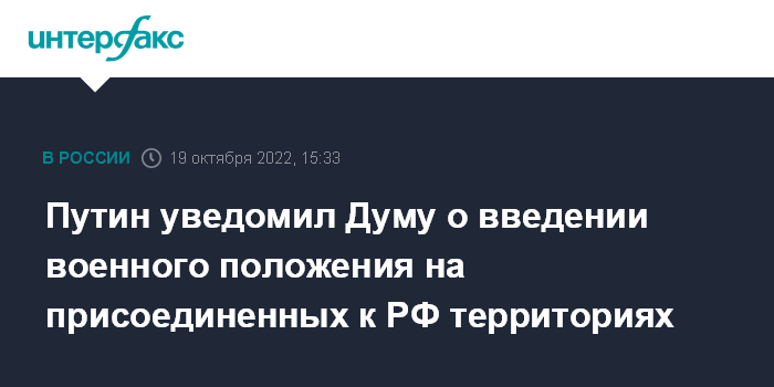 Москва. 19 октября. INTERFAX.RU - Президент РФ Владимир Путин уведомил Госдуму, что в ДНР, ЛНР, Запорожской и Херсонской областях военное положение вводится с 20 октября, сообщил первый вице-спикер нижней палаты Александр Жуков.