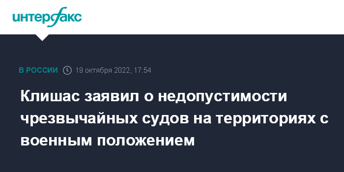 Москва. 19 октября. INTERFAX.RU - Создание чрезвычайных судов на присоединенных территориях (ДНР, ЛНР, Запорожская и Херсонская области) во время действия военного положения не может происходить. Об этом заявил глава комитета Совета Федерации по конституционному законодательству и госстроительству Андрей Клишас.