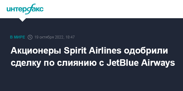 Москва. 19 октября. INTERFAX.RU - Акционеры американской авиакомпании Spirit Airlines Inc одобрили сделку по слиянию с JetBlue Airways Corp, в рамках которой будет создан пятый по величине авиаперевозчик в США.