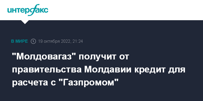 Москва. 19 октября. INTERFAX.RU - Правительство Молдавии предоставит заем компании "Молдовагаз", чтобы она смогла своевременно рассчитаться с "Газпромом".