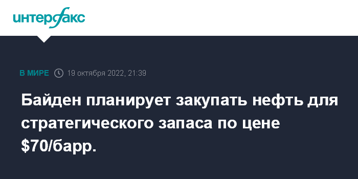 Москва. 19 октября. INTERFAX.RU - Президент США Джо Байден призывает увеличить добычу нефти в США, обещает в будущем покупать ее у нефтедобывающих компаний по цене примерно в $70 за баррель для пополнения стратегического нефтяного запаса.