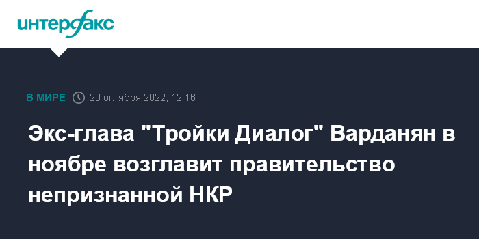 Москва. 20 октября. INTERFAX.RU - Бывший руководитель компании "Тройка Диалог", первый президент московской школы управления "Сколково" Рубен Варданян согласился занять должность госминистра (главы правительства) непризнанной Нагорно-Карабахской республики (НКР).