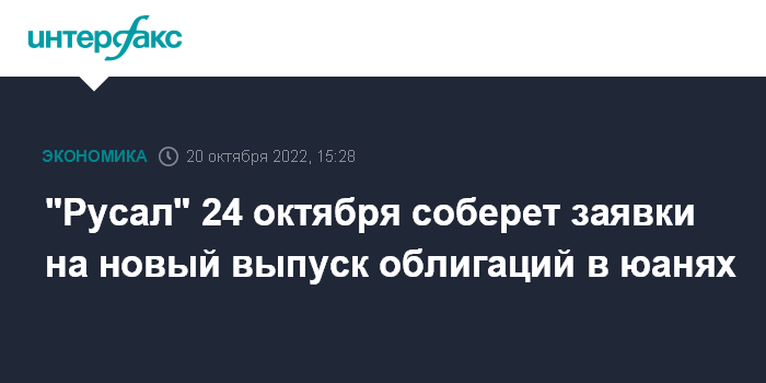 Москва. 20 октября. INTERFAX.RU - МКПАО "ОК Русал" 24 октября планирует собрать заявки на новый выпуск облигаций в юанях, сообщил "Интерфаксу" источник на финансовом рынке.