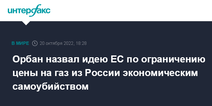 Москва. 20 октября. INTERFAX.RU - Премьер-министр Венгрии Виктор Орбан назвал брюссельский план по ограничению цены на газ из России экономическим самоубийством, которое не поможет Украине.