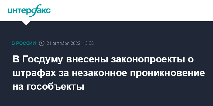 Москва. 21 октября. INTERFAX.RU - В Госдуму внесены проекты законов о введении повышенной административной ответственности за незаконное проникновение на объекты силовых ведомств и важные государственные объекты, а также уголовной ответственности в случае повторного проникновения.
