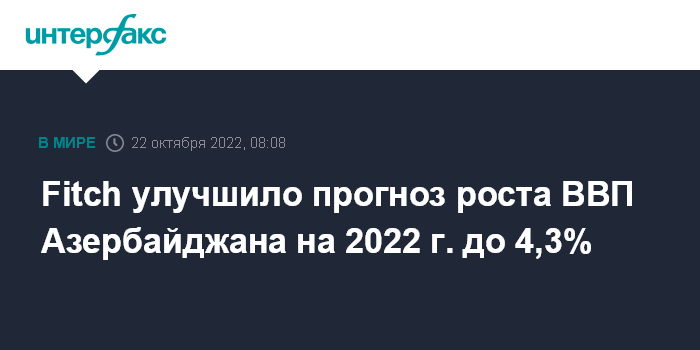 Москва. 22 октября. INTERFAX.RU - Международное рейтинговое агентство Fitch Ratings прогнозирует рост ВВП Азербайджана в 2022 году на уровне 4,3%.