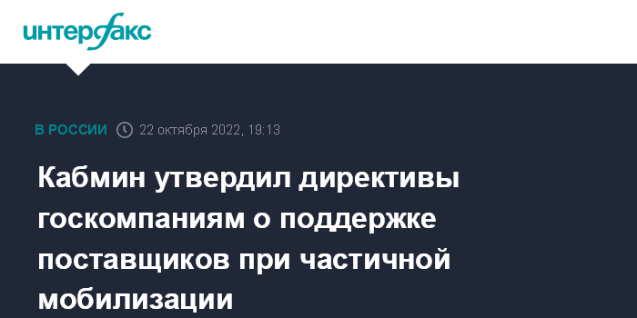 Сами директивы распространяются только на крупнейшие госкомпании (их перечень определен соответствующим распоряжением правительства) и обязывает их в течении 10 дней провести заседания советов директоров, на которых должен быть рассмотрен вопрос о возможности продления сроков исполнения договоров и неприменения штрафных санкций при нарушении из-за частичной мобилизации.