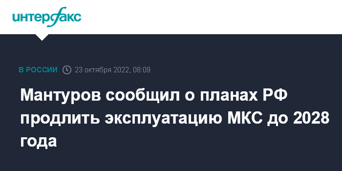 Москва. 23 октября. INTERFAX.RU - Россия, вероятно, продлит соглашение по Международной космической станции (МКС) до 2028 года, отталкиваясь от сроков строительства национальной орбитальной станции, заявил вице-премьер РФ, глава Минпромторга Денис Мантуров.