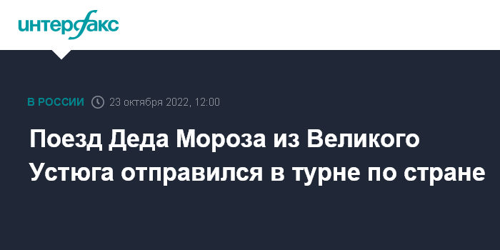Москва. 23 октября. INTERFAX.RU - Сказочный поезд Деда Мороза из Великого Устюга вновь отправился в путешествие по России, сообщил в социальной сети "ВКонтакте" глава Великоустюгского района Александр Кузьмин.