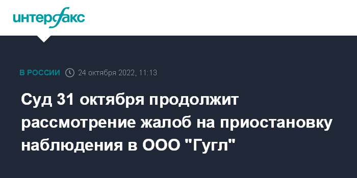 Москва. 24 октября. INTERFAX.RU - Арбитражный суд Московского округа объявил перерыв до 31 октября в рассмотрении жалоб на приостановление процедуры наблюдения в ООО "Гугл" - российской "дочке" Google (входит в группу Alphabet).