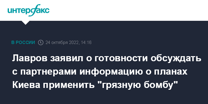 Москва. 24 октября. INTERFAX.RU - Россия располагает конкретными данными по поводу намерения Украины применить "грязную бомбу", Москва готова работать с партнерами на экспертном уровне по этому вопросу, заявил глава МИД РФ Сергей Лавров.