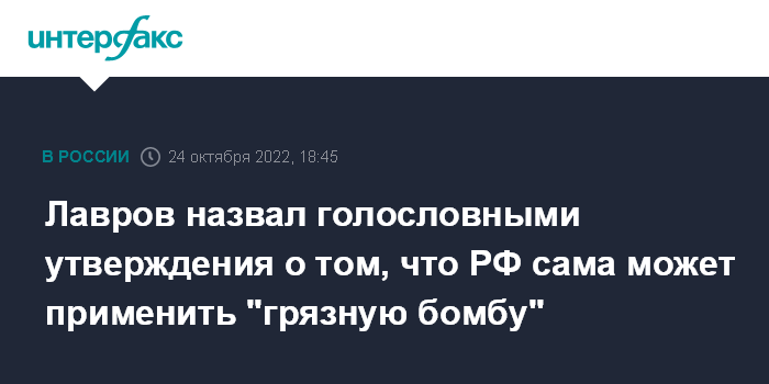 Москва. 24 октября. INTERFAX.RU - Глава МИД РФ Сергей Лавров назвал несерьёзными заявления о том, что Москва может сама применить "грязную бомбу".