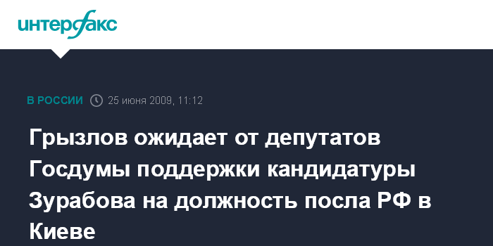 Москва. 25 июня. INTERFAX.RU - Председатель Госдумы Борис Грызлов считает, что депутаты поддержат кандидатуру Михаила Зурабова на должность посла РФ на Украине.