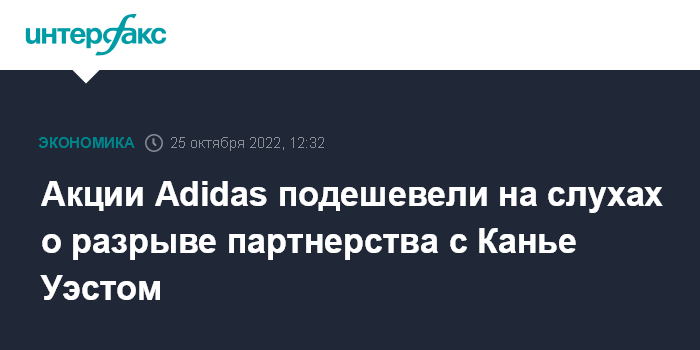 Москва. 25 октября. INTERFAX.RU - Котировки германского производителя спортивных товаров Adidas AG снижаются на публикации Bloomberg о том, что компания планирует расторгнуть партнерское соглашение с американским музыкантом Канье Уэстом. Источники агентства говорят, что о расторжении сделки может быть объявлено уже 27 октября.