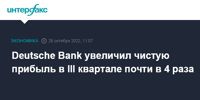 Москва. 26 октября. INTERFAX.RU - Deutsche Bank AG, крупнейший банк Германии, резко увеличил чистую прибыль и выручку в третьем квартале 2022 года, превзойдя ожидания аналитиков.