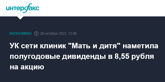 УК сети клиник "Мать и дитя" наметила полугодовые дивиденды в 8,55 рубля на акцию