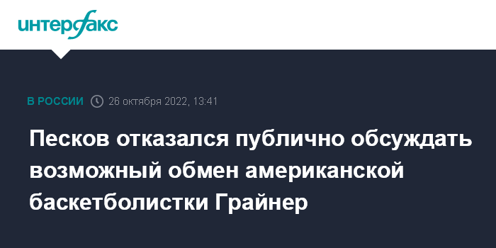 Москва. 26 октября. INTERFAX.RU - Вопросы обмена заключенными могут обсуждаться только в режиме тишины и информационной изоляции, заявил пресс-секретарь президента РФ Дмитрий Песков, комментируя возможный обмен осужденной в России американской баскетболистки Бриттни Грайнер.