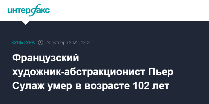 Москва. 26 октября. INTERFAX.RU - Ушел из жизни французский художник-абстракционист Пьер Сулаж (1919-2022 гг.), почти всю жизнь писавший картины черной краской, сообщает в среду французская пресса.