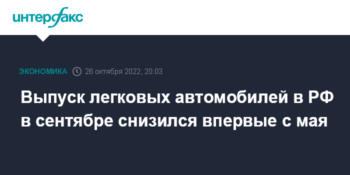 Москва. 26 октября. INTERFAX.RU - Производство легковых автомобилей в РФ в сентябре 2022 года снизилось впервые с мая - на 3,8%, до 23,8 тыс. шт., следует из данных Федеральной службы государственной статистики РФ (Росстат).