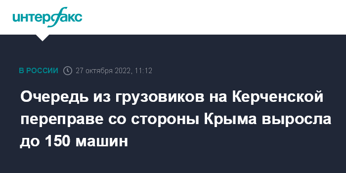 Москва. 27 октября. INTERFAX.RU - Порядка 150 грузовых автомобилей ожидают переправы паромами через Керченский пролив со стороны Крыма, сообщает в четверг пресс-служба республиканского Минтранса.