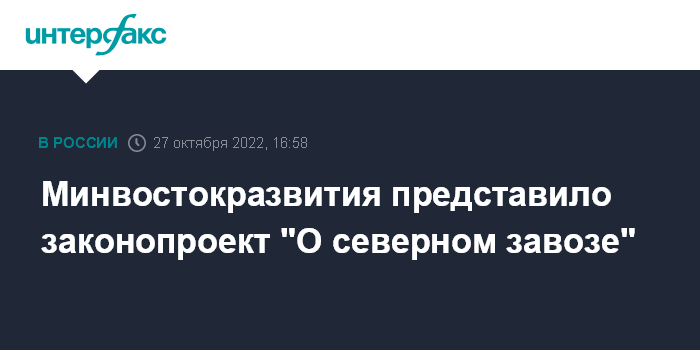 Проект федерального закона "О северном завозе" разработан Минвостокразвития по поручению президента РФ. На текущий момент получено согласования законопроекта от всех 25 субъектов РФ, которых касается документ. Также согласования получены от профильных ведомств и госкорпорации "Росатом". Законопроект направлен для получения заключений Минюста и Института законодательства и сравнительного правоведения при правительстве, после чего будет внесен в правительство. Планируется, что законопроект вступит в силу с 2024 года.