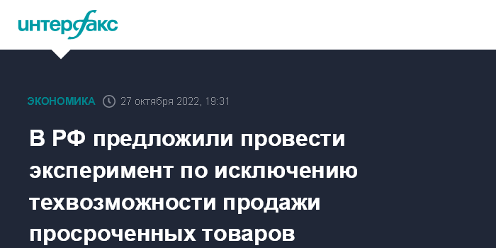 Москва. 27 октября. INTERFAX.RU - Минпромторг РФ предложил провести эксперимент по исключению технической возможности продажи пищевой и табачной продукции в случае ее незаконного введения в оборот или истечения сроков годности.