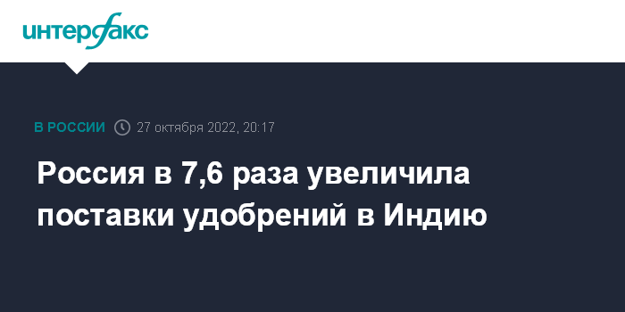 Москва. 27 октября. INTERFAX.RU - Российская Федерация увеличила поставки удобрений в Индию в 7,6 раза, заявил президент РФ Владимир Путин в четверг в ходе заседания дискуссионного клуба "Валдай".