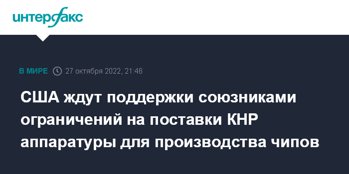 Москва. 27 октября. INTERFAX.RU - США ожидают, что вскоре они договорятся с союзниками об их присоединении к ограничениям, ранее введенным Вашингтоном на экспорт в КНР наиболее современной аппаратуры для производства чипов, заявил в четверг замминистра торговли США по промышленности и безопасности Алан Эстевес.