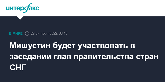 Москва. 28 октября. INTERFAX.RU - Премьер-министр РФ Михаил Мишустин 28 октября примет участие в заседании Совета глав правительств СНГ в Астане.