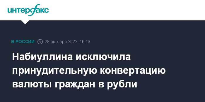 "Что касается так называемой принудительной конвертации валюты. Наша позиция заключалась и заключается в том, что если это не предусмотрено договорами, то принудительной конвертации валюты в рубли не должно быть, и у граждан-клиентов должен быть выбор - оставить свои средства в иностранной валюте - беря на себя риски, комиссии и так далее - либо конвертировать в рубли. Мы, кстати, видим, что люди сами добровольно сейчас достаточно активно конвертируют из иностранной валюты тех стран, которые ввели санкции, в рубли или валюту дружественных стран, но выбор такой должен быть", - сказала она.