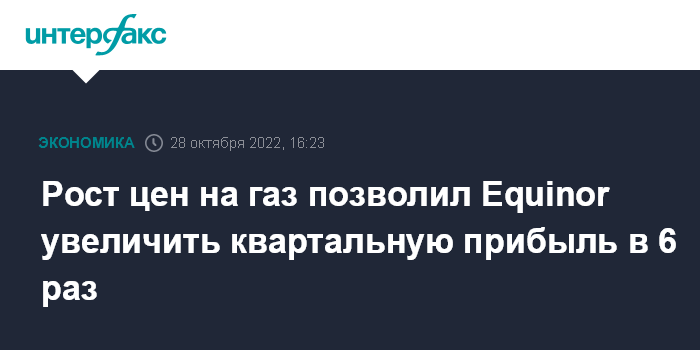 Москва. 28 октября. INTERFAX.RU - В III квартале 2022 года норвежская нефтегазовая компания Equinor ASA увеличила чистую прибыль более чем в шесть раз в годовом исчислении благодаря повышению объемов производства и скачку цен на энергоресурсы в мире.