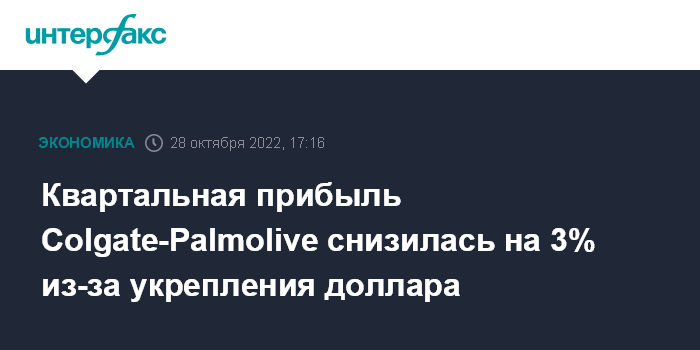 Москва. 28 октября. INTERFAX.RU - В III квартале 2022 года американский производитель потребительских товаров Colgate-Palmolive Co. зафиксировал снижение чистой прибыли на 3% из-за роста операционных расходов, а также укрепления доллара США.