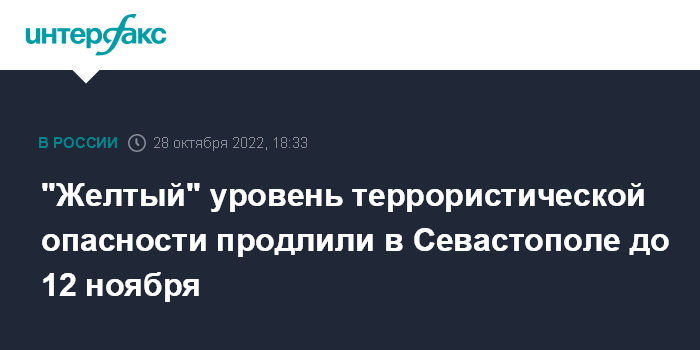 Москва. 28 октября. INTERFAX.RU - Высокий уровень террористической опасности, введенный в Севастополе в конце июля, продолжит действовать еще как минимум до 12 ноября, сообщается на сайте правительства города.