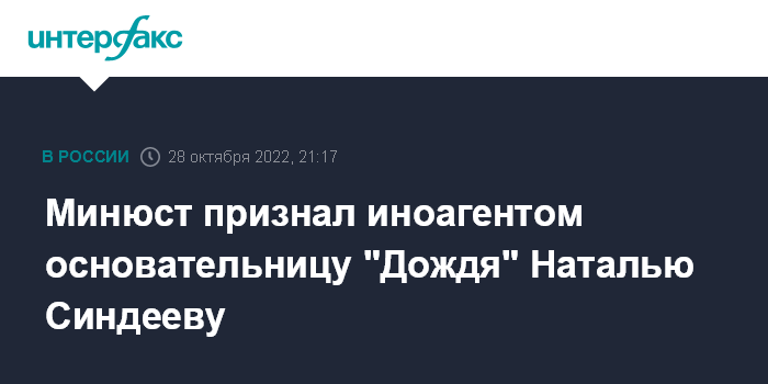 Москва. 28 октября. INTERFAX.RU - Минюст признал физлицами-иноагентами шесть человек, среди которых гендиректор и основатель телеканала "Дождь" (признан СМИ-иноагентом) Наталья Синдеева. Всем им вменяется политическая деятельность и получение финансирования из Украины.