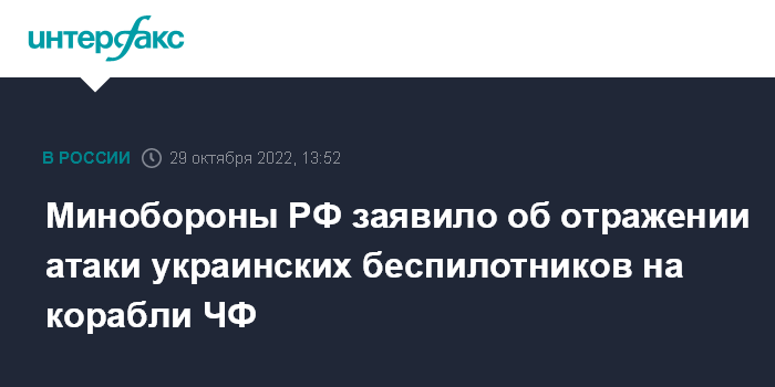 Москва. 29 октября. INTERFAX.RU - Российские военные сообщили, что утром в субботу отразили атаку украинских сил с применением беспилотников на корабли Черноморского флота в Севастополе.