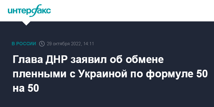Москва. 29 октября. INTERFAX.RU - Обмен пленными с Украиной по формуле 50 на 50 пройдет в субботу, 29 октября, заявил врио главы Донецкой народной республики Денис Пушилин.