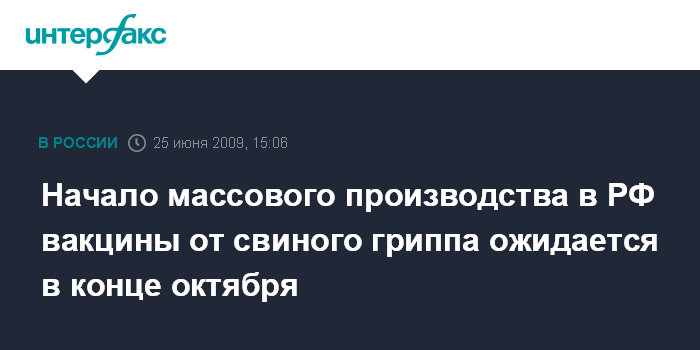 Москва. 25 июня. INTERFAX.RU - Массовое производство вакцины от гриппа H1N1 в России начнется в середине осени, заявил руководитель НИИ гриппа РАМН Олег Киселев.