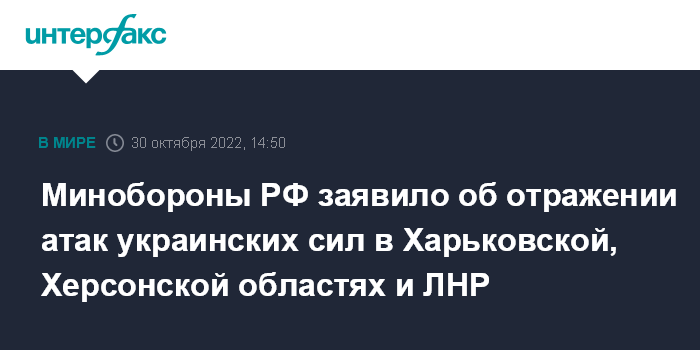 Москва. 30 октября. INTERFAX.RU - Российские военные за минувшие сутки отразили атаки вооружённых сил Украины (ВСУ) в Харьковской и Херсонской областях, а также на территории ЛНР, сообщил официальный представитель министерства обороны РФ Игорь Конашенков.
